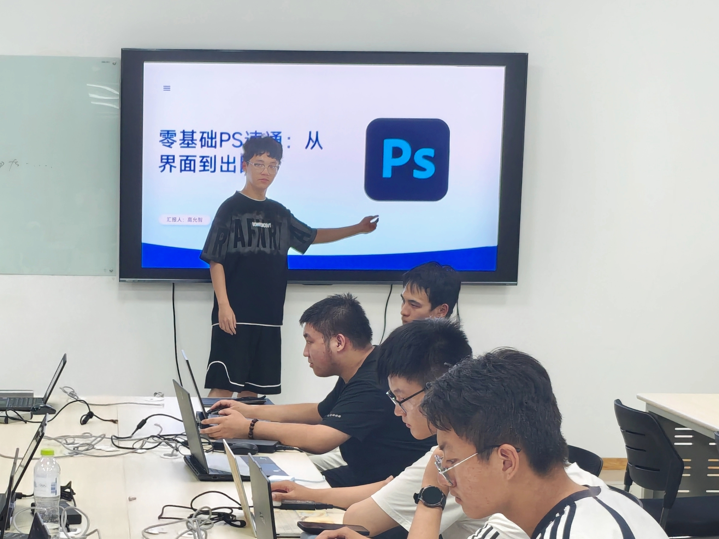 进入实操环节,同学们运用Photoshop处理培训提供的影视样片素材,分组展开 Photoshop 实践演练。负责人在教室中巡回指导,针对大家在图层蒙版使用、色彩平衡调节中遇到的问题,进行演示与纠正。