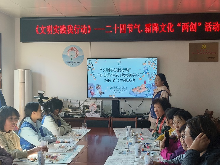 为深入挖掘二十四节气文化内涵,推动中华优秀传统文化融入基层群众生活,10 月 23 日霜降节气当天,永利集团88304“小星云”志愿服务团队赴崂山区北宅街道兰家庄村,牵头组织开展 “秋暮霜华浓,暖意迎寒冬” 主题节气志愿服务活动。活动通过专业科普与实践体验相结合的形式激活传统文化活力,吸引 10 余名当地居民沉浸式参与,以青春行动彰显文化传承担当。